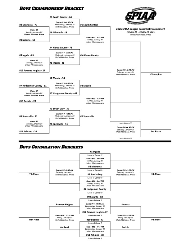 SPIAA League Basketball Tournament - High School Boys vs. Satanta. Good Luck Aces! Students will be dismissed at 11 and will load bus at 11:15. Updated Bracket Attached.