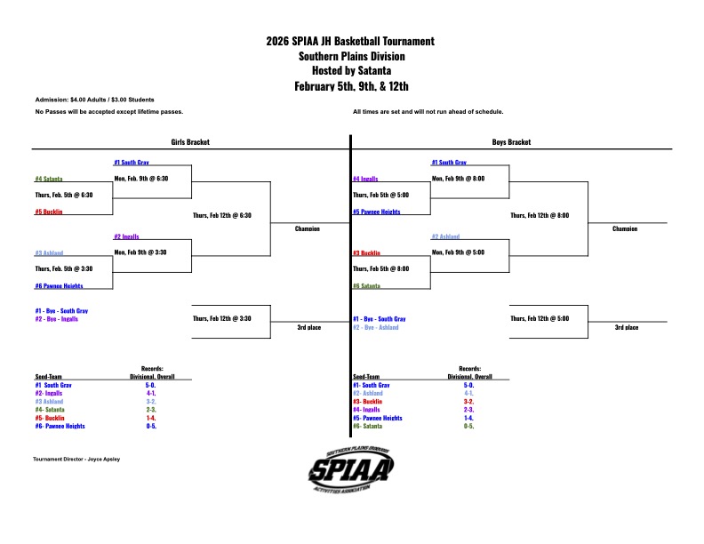 Please see the attached SPIAA Junior High Basketball Bracket. Tournament is beginning on Thursday 2/5/26.