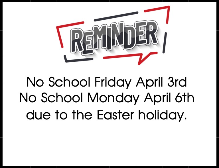 Announcements: REMINDER - NO SCHOOL tomorrow, Friday April 3rd and Monday April 6th due to Easter holiday.High School Track @ Meade. Good Luck Aces! Students will be dismissed at 12:45 and leave at...